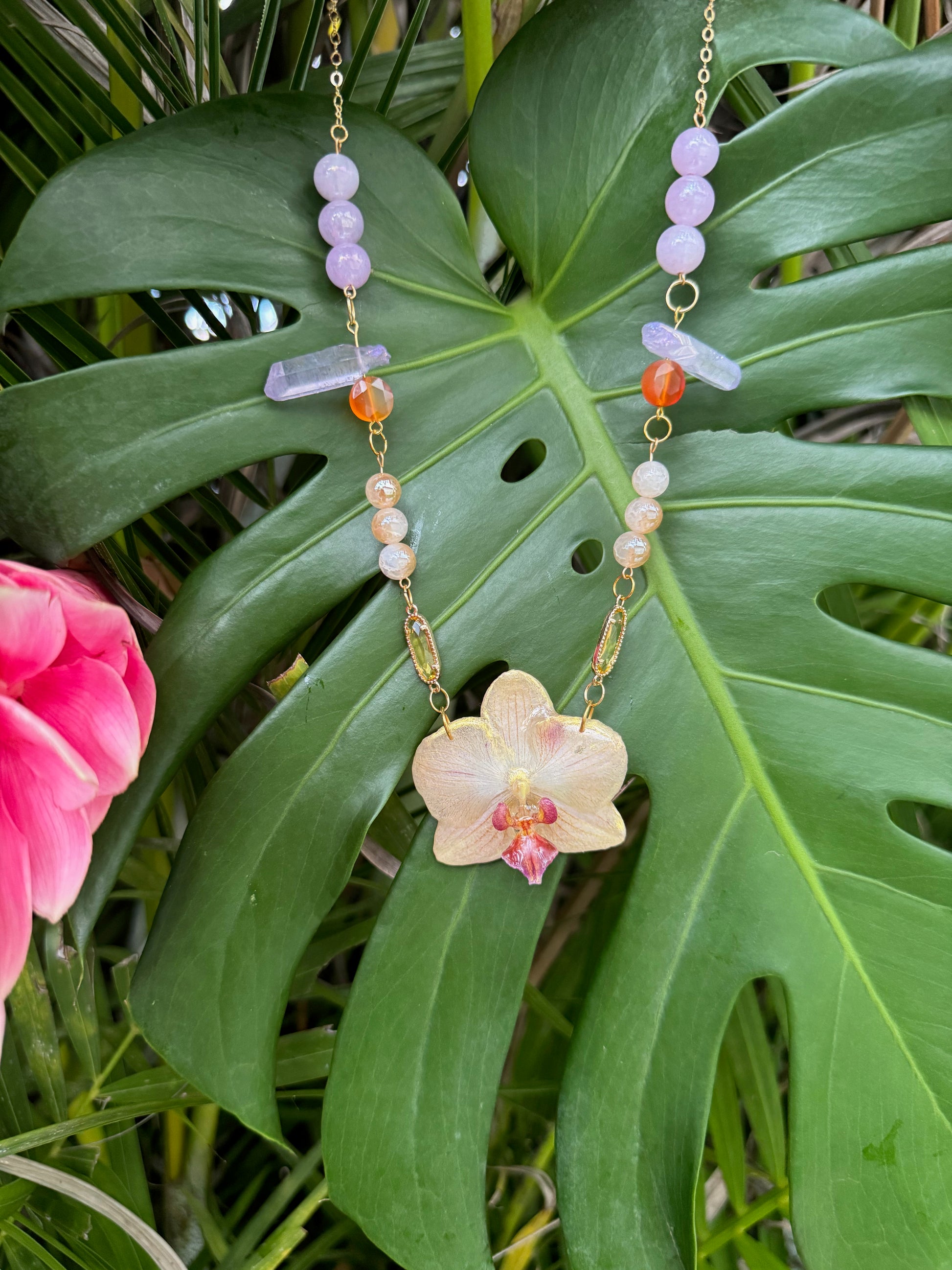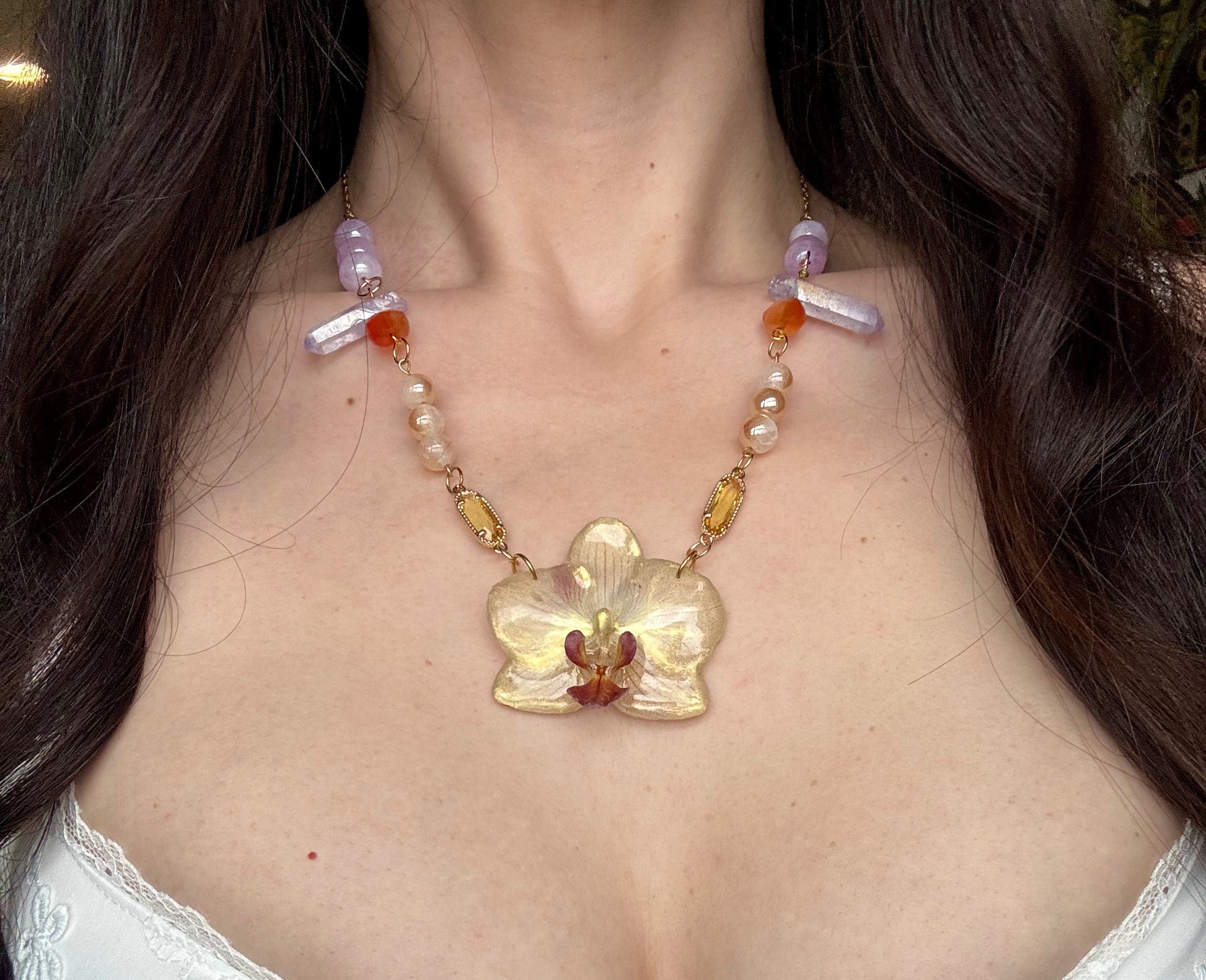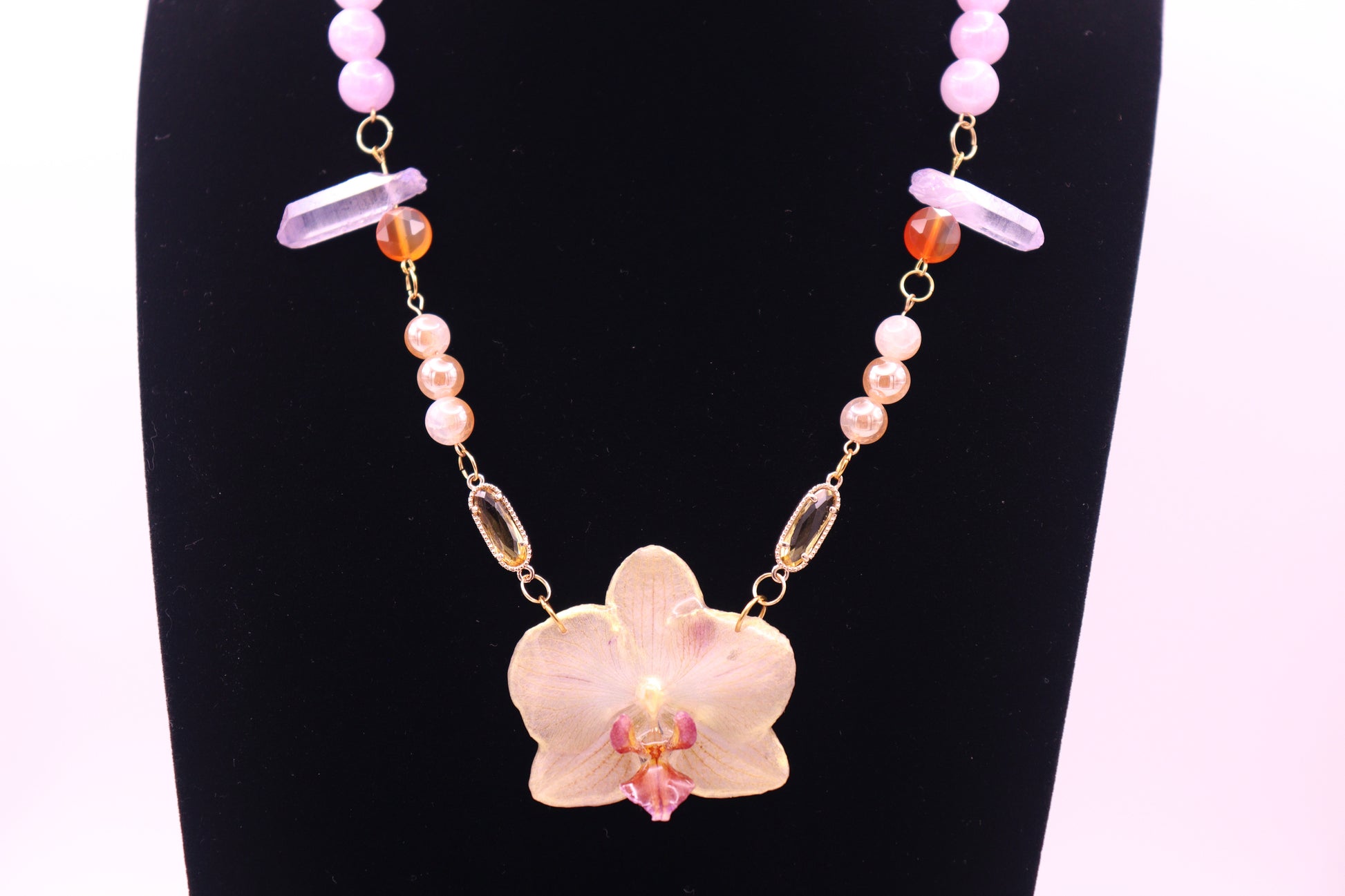Phalaenopsis ‘Fuller’s Gold Stripe’ orchid carefully preserved and encased in resin, finished with a soft golden shimmer.