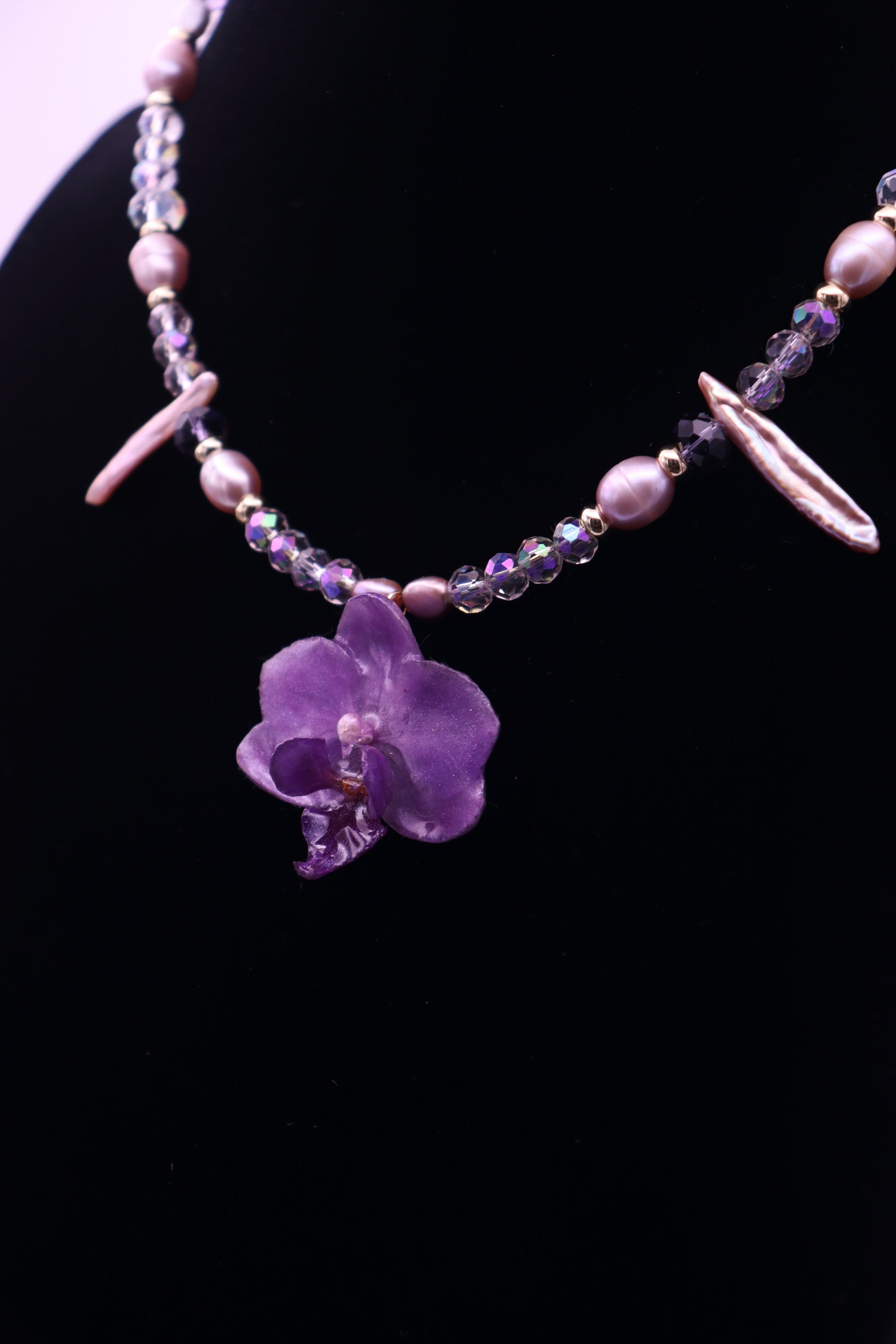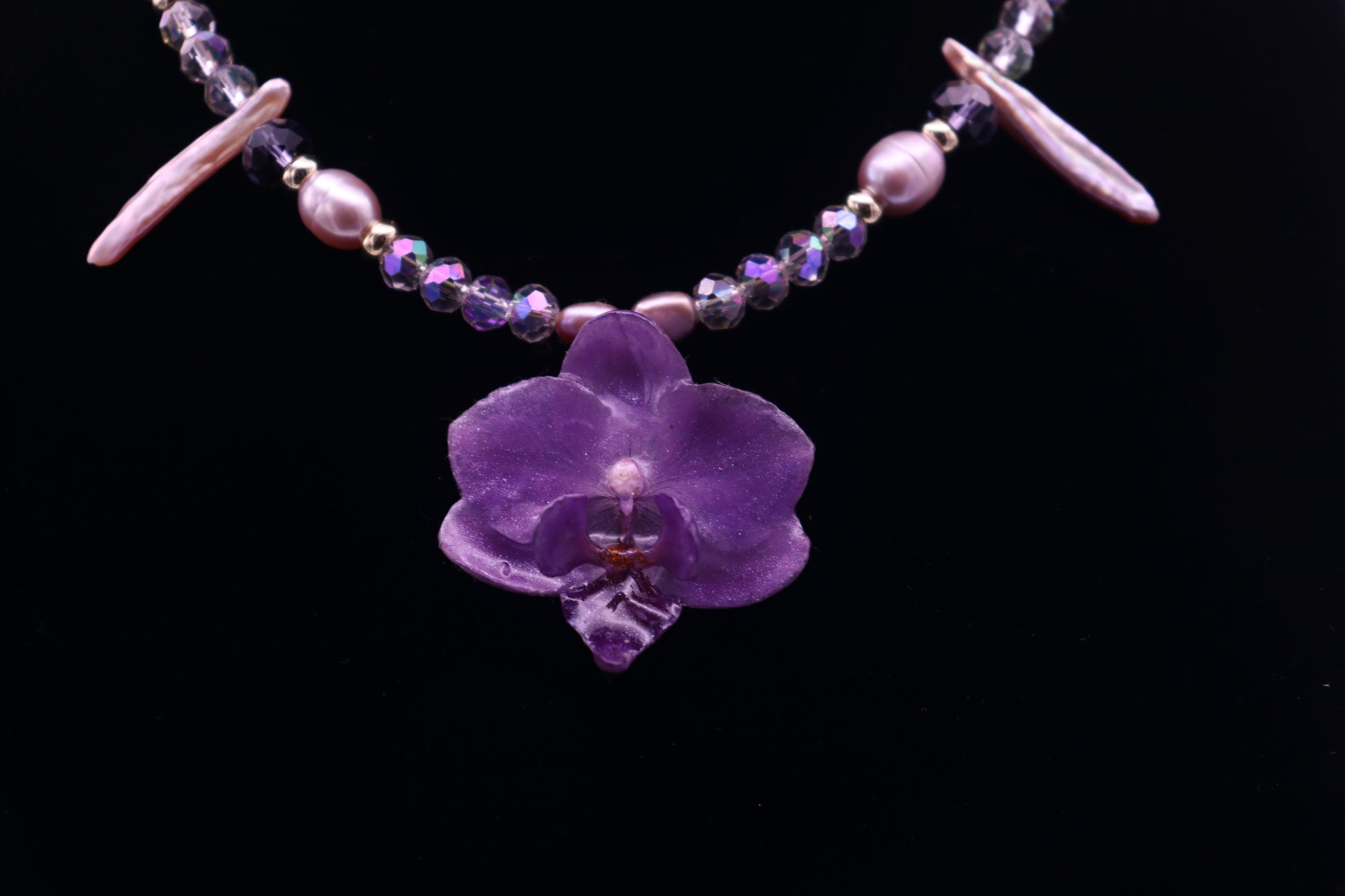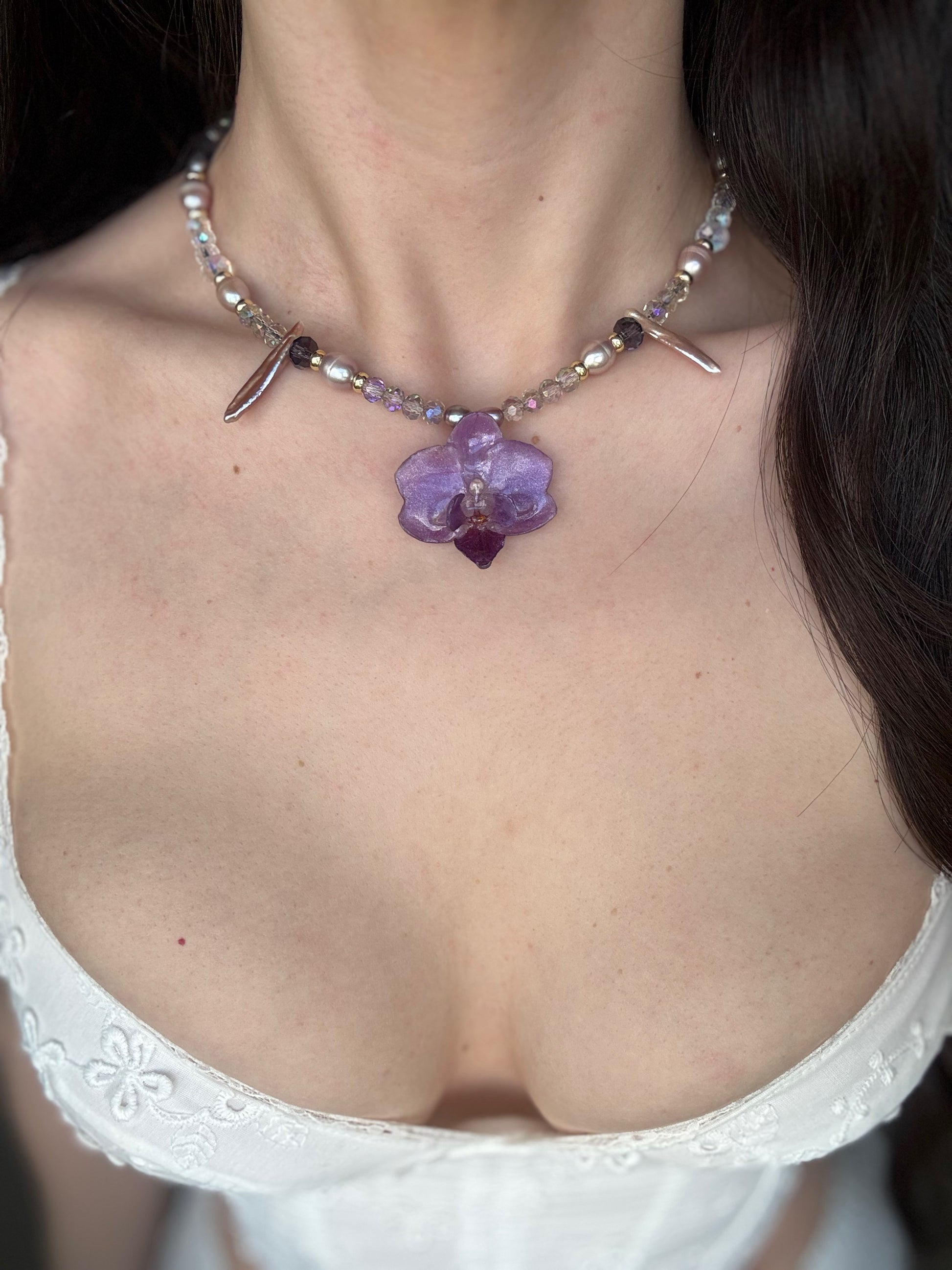 Our Megara chocker/necklace features a mini purple phal. orchid with added shimmer.