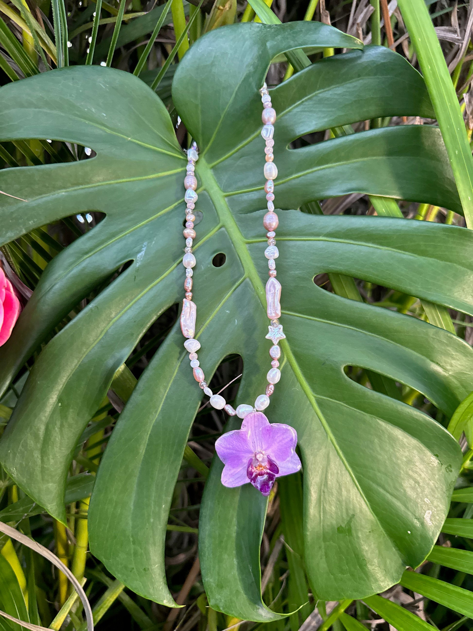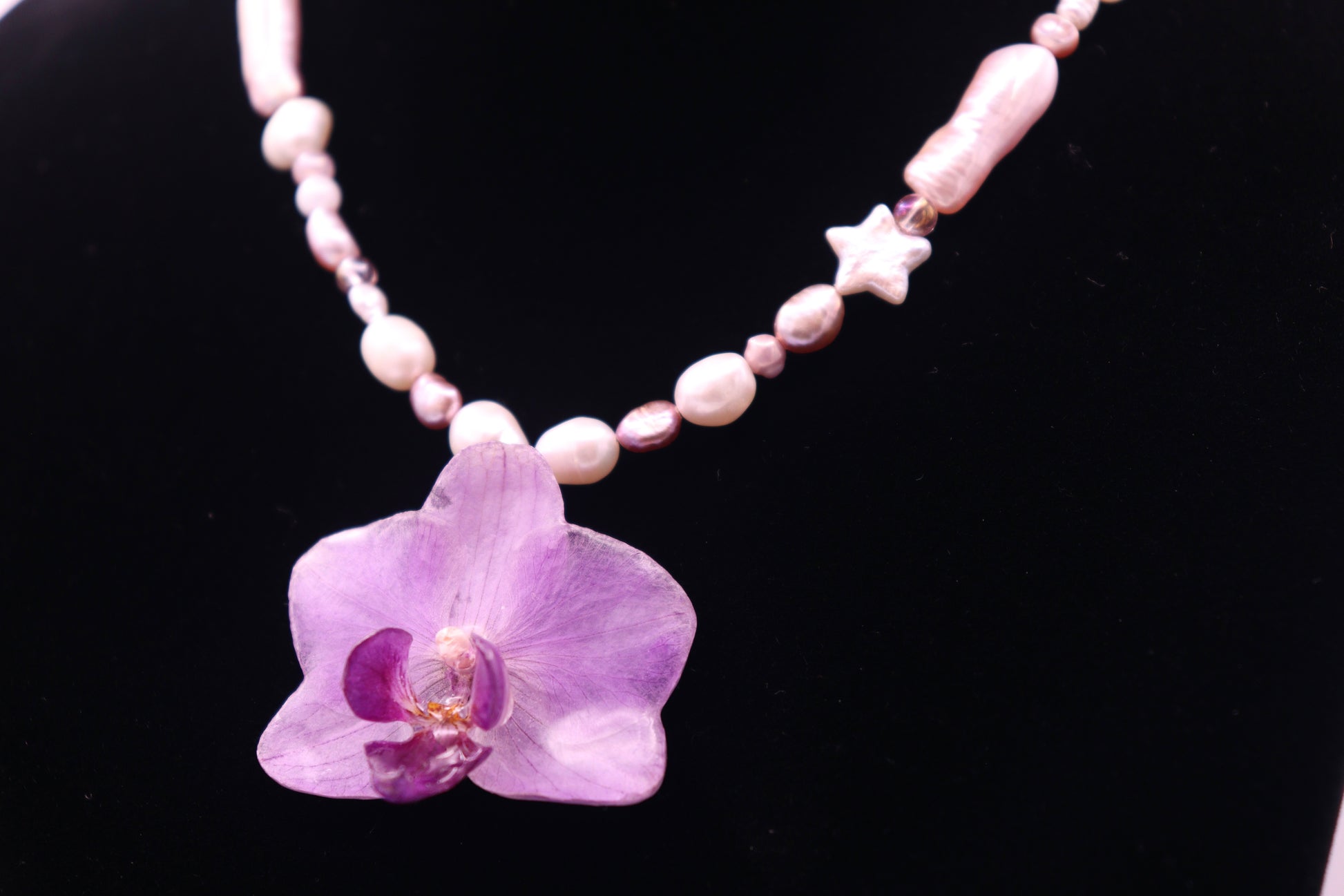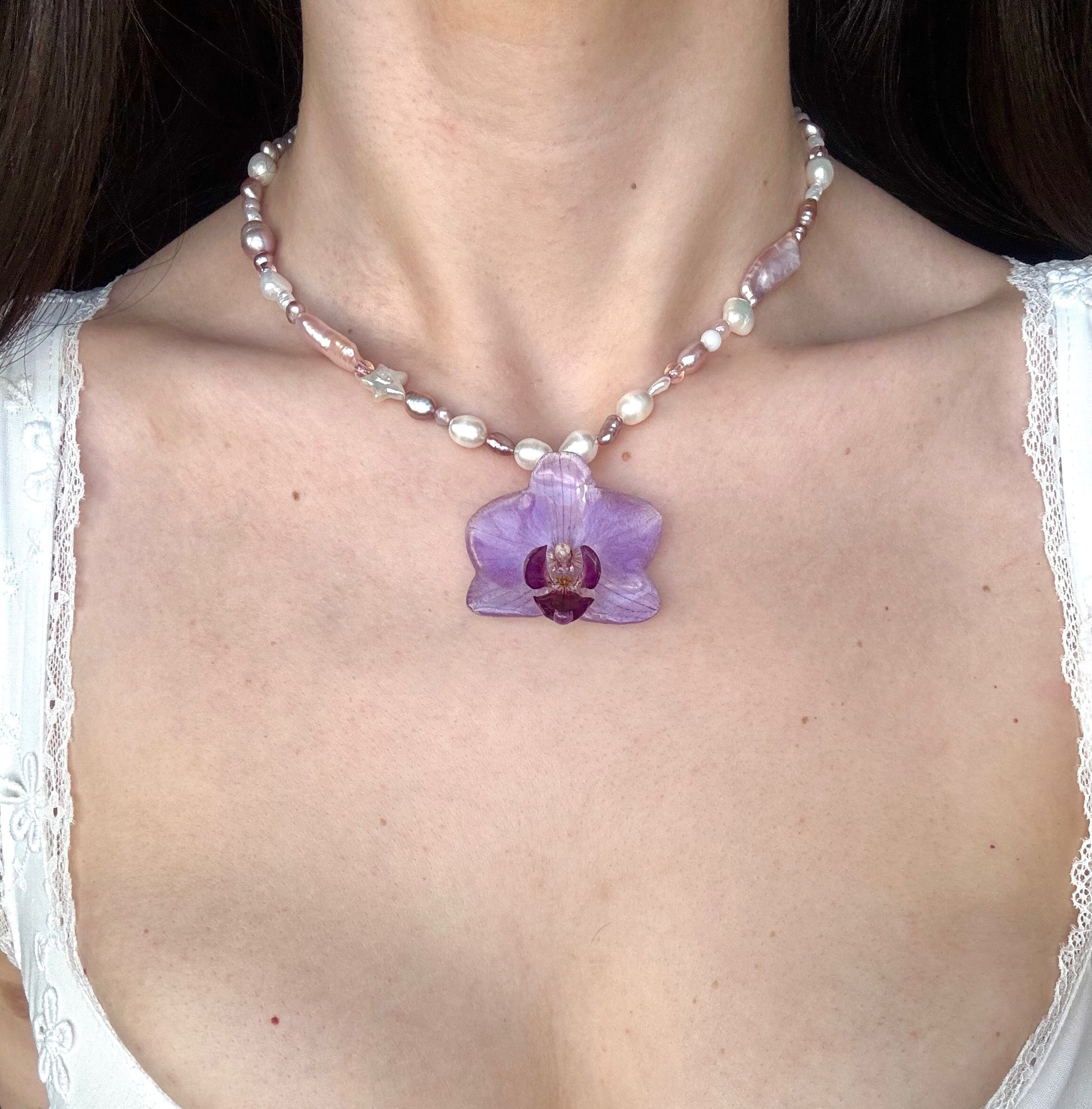 Our 'Pearl' Choker/Necklace features a small phaelenopsis orchid, preserved carefully maintaining the flowers natural purple color.